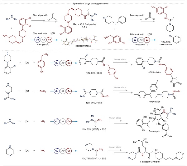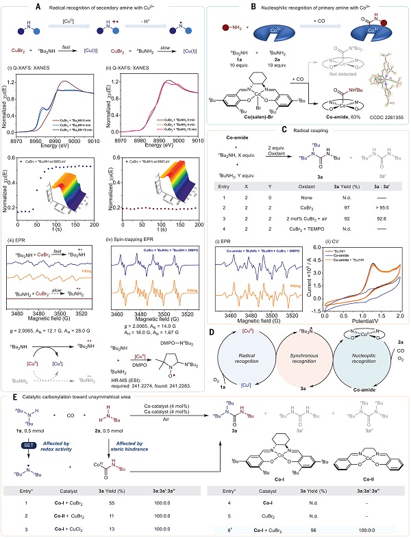 近日,中科院兰州化学物理研究所何林研究员联合武汉大学雷爱文教授在Science上发表了题为“Synchronous recognition of amines in oxidative carbonylation toward unsymmetrical ureas”的论文,报道使用了一种同步识别策略来区分活化仲胺和伯胺。与伯胺相比,仲胺更容易被氧化。相反,伯胺的空间位阻较小,与仲胺相比,这可能允许伯胺优先进攻金属中心。以这些原理为指导,研究人员提出了一种“同步识别”策略,该策略依赖于氧化还原性质和亲核性的差异来识别不同的胺。具体的,一种金属催化剂可以通过将仲胺氧化为自由基中间体来有效地区分仲胺和伯胺,另一种催化剂可以通过空间控制的亲核羰基化过程优先与伯胺反应,得到金属酰胺。通过协同催化将这些片段偶联,可以产生高选择性的不对称脲。研究人员成功地证明了这一策略在使用协同Cu-Co双金属催化合成不对称脲中的应用。该方法分别通过自由基和亲核活化以1:1的摩尔比区分仲胺和伯胺,选择性合成不对称脲。