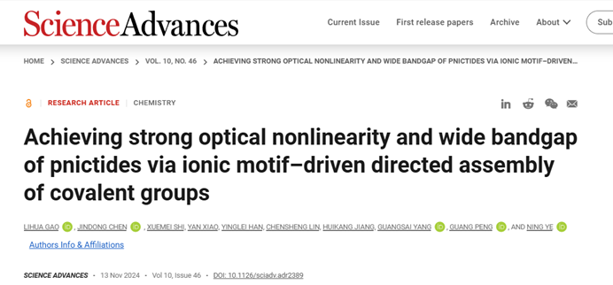 Lihua Gao et al., Achieving strong optical nonlinearity and wide bandgap of pnictides via ionic motif–driven directed assembly of covalent groups. Sci. Adv. 10, eadr2389(2024). DOI:10.1126/sciadv.adr2389