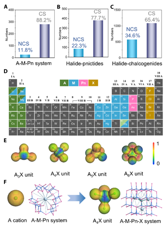 图1 非中心对称和中心对称结构统计,A-M-Pn-X物相化学空间,离子基元静电势示意图