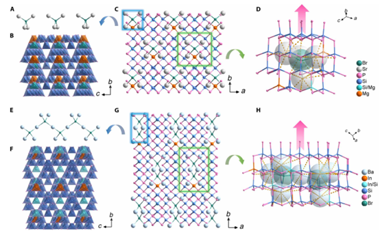 为了解决这一难题,天津理工大学陈金东副研究员和叶宁教授在Science Advances期刊发表了题目为“Achieving strong optical nonlinearity and wide bandgap of pnictides via ionic motif–driven directed assembly of covalent groups”的研究论文,第一作者为博士研究生高利华。该团队提出了新的磷属非线性光学晶体设计策略—构筑非对称离子基元驱动共价基团定向排列,利用非对称离子基元驱动共价基团定向以及刚柔耦合双策略,成功设计并合成了四种新的非中心对称的磷化物:[Sr4Br]2[MII3Si25P40](MII = Mg, Cd)和[Ba3Br][MIIISi10P16](MIII = Ga, In)。这些材料表现出优异的非线性光学性能,倍频强度为传统红外非线性晶体的5.2至7.5倍,光学带隙为1.81至1.90电子伏特,双折射值为0.030至0.051,红外透过可到9微米。