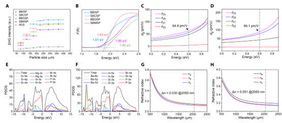 此外,非中心对称结构诱导机制研究表明具有类金刚石静电力场的(Sr4Br)和(Ba4Br)非对称离子基元有效打破了反演对称性,实现了共价四面体基团的同向排列。此外,具有较大基团柔度的第二共价构建单元(MII/IIIP4四面体)可以显著调节非线性光学性质和双折射率,为调节关键参数提供了更广阔的空间。本研究为探索高性能磷属非线性光学晶体材料开辟了新的化学空间。