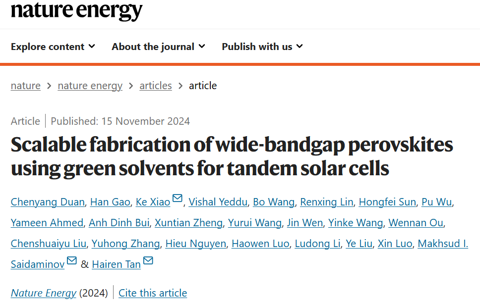 原文信息:Duan, C., Gao, H., Xiao, K. et al. Scalable fabrication of wide-bandgap perovskites using green solvents for tandem solar cells. Nat Energy (2024).