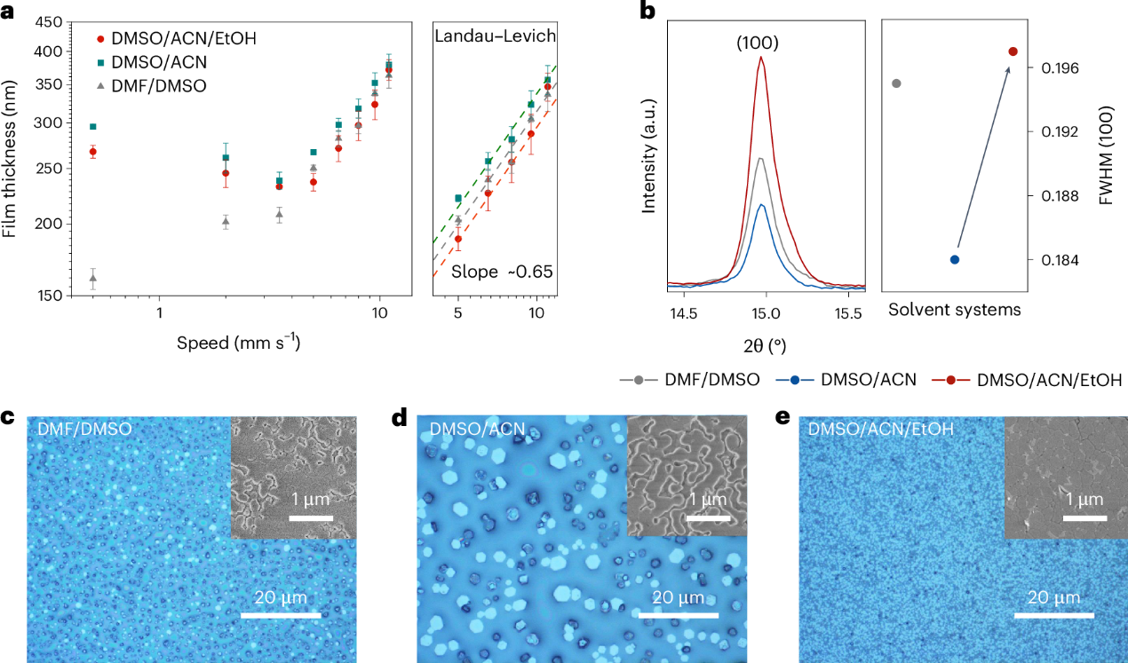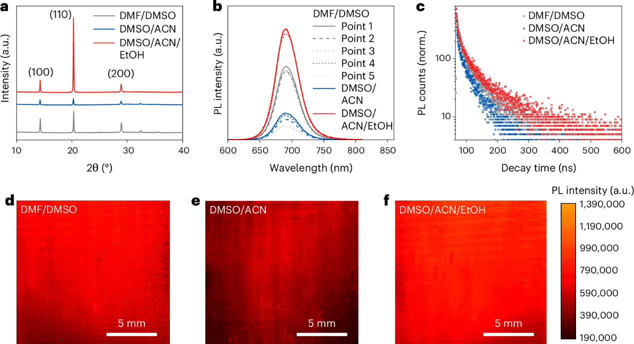 图3 使用三种溶剂系统制造的WBG钙钛矿薄膜的表征 © 2024 Springer Nature Limited