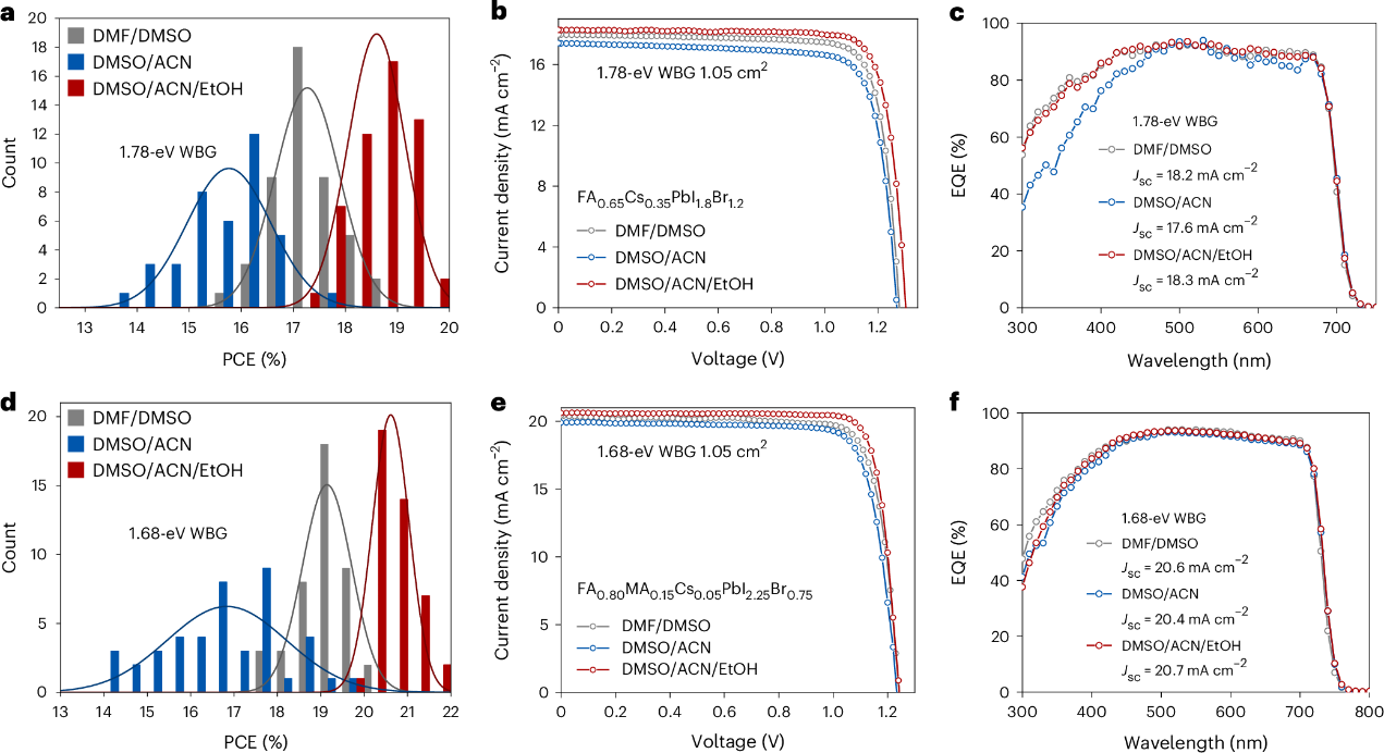图4 利用不同溶剂系统制备的1.78 eV和1.68 eV宽带隙钙钛矿太阳能电池的光伏性能 © 2024 Springer Nature Limited