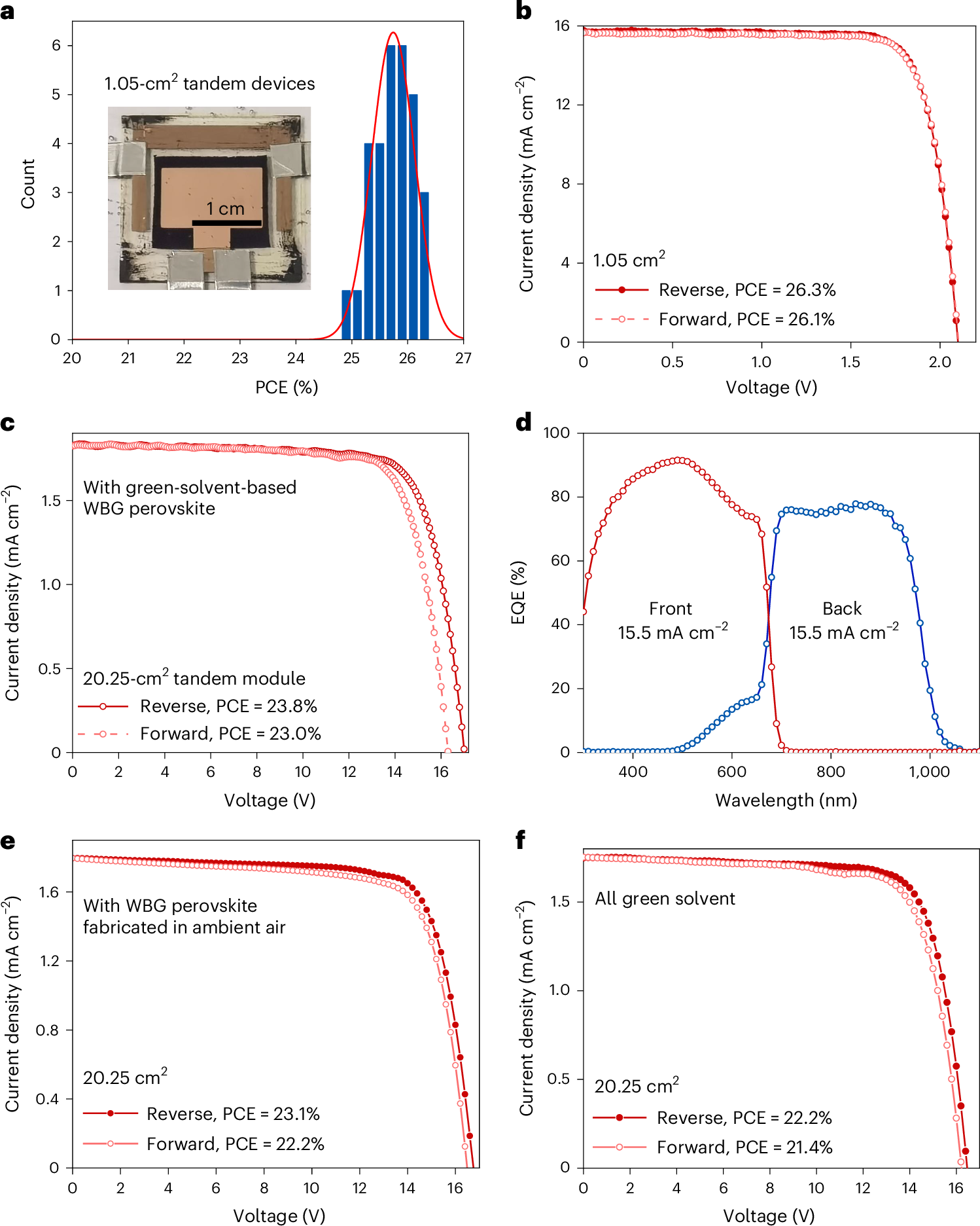 图5 全钙钛矿叠层太阳能电池和大面积钙钛矿叠层模块的光伏性能 © 2024 Springer Nature Limited