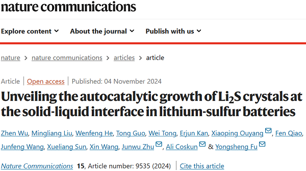 原文详情:Unveiling the autocatalytic growth of Li2S crystals at the solid-liquid interface in lithium-sulfur batteries (Nat Commun 2024, 15, 9535)