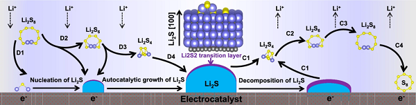 图1 电催化剂表面择优取向[100]Li2S晶体生长分解过程中自催化转化机理示意图 © 2024 Springer Nature