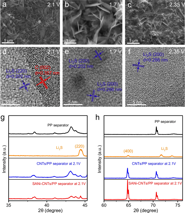 本研究揭示了Li2S(100)的自催化生长机制及其在加速Li2S晶体/LiPS界面处LiPS转化动力学中的作用。电催化剂还被证明在Li2S(100)的优先生长中起着关键作用,为Li2S成核提供了能量有利的界面。带有SANi CNTs/PP隔膜的电池在0.5、1和2 oC下循环500次后,显示出873、723和629 mAh g-1的可逆容量,具有优异的容量保持性。具有超轻SANi CNTs/PP隔膜的软包电池在0.1 C的电流密度下提供了约6 mAh cm-2的高初始放电面积容量。即使在100次循环后,仍可以保持4.2 mAh cm-2的高容量,这证明了SANi CNTs/PP隔膜在实际应用中的潜力。从更广泛的角度来看,这项工作为控制Li-S电池中固-固转化反应的动力学提供了关键的见解。
