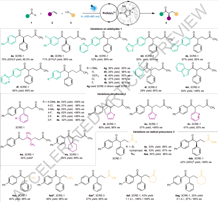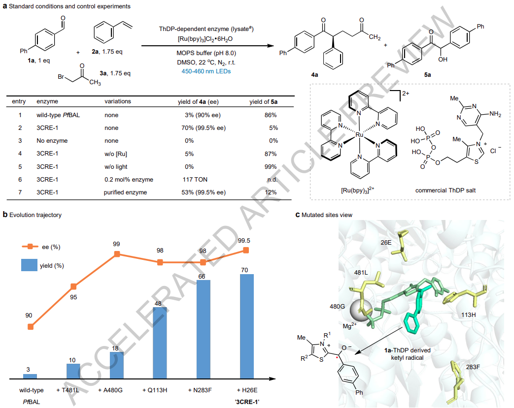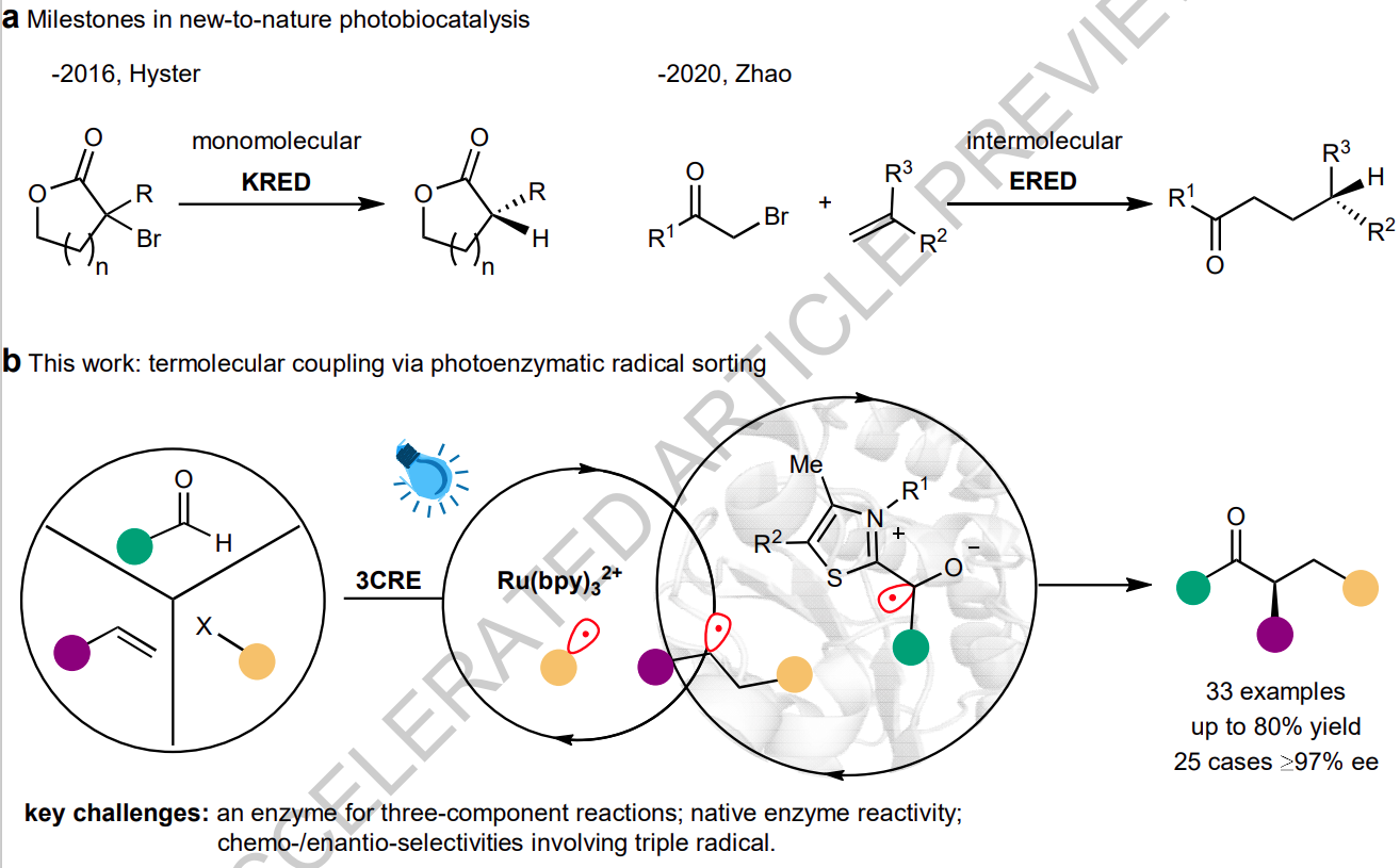 多组分反应在快速构建复杂化学构件方面具有显著优势,但由于酶的活性位点通常不适应同时处理多种底物,尤其是涉及自由基中间体时,酶法实现多组分反应仍然较为罕见。尽管化学催化自由基分类为多种反应提供了一种可行策略,但由于自由基的立体化学控制存在固有困难,实现对映选择性的过程极具挑战。为了克服这些限制,采用了一种创新的方法:通过定向进化技术重新利用硫胺依赖性酶,并结合光氧化催化,成功实现了光生物催化对映体选择性三组分自由基交叉偶联。这一方法利用了三种易得的起始材料醛、α-溴羰基和烯来合成对映体富集的酮产物。