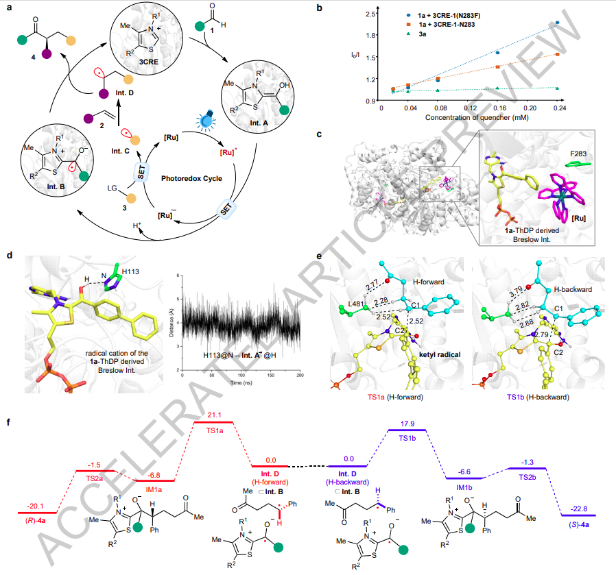 1.研究机理很好地解释了对映体选择性和新反应性的来源。实现化学/对映体选择性酶促三自由基分选的关键在于多功能 ThDP 辅助因子、可调式活性位点、温和且生物兼容的光诱导的 SET 途径,以及多种自由基的相匹配。