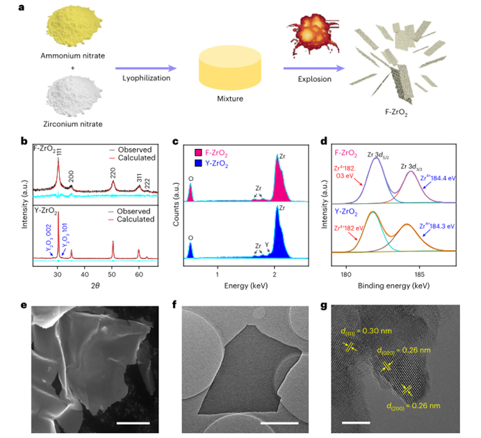 随后,研究人员展示了利用爆炸法制备F-ZrO2的工艺流程,并通过相关表征手段成功验证了催化剂的成功制备。F-ZrO2的X射线衍射(XRD)峰仅分配给萤石ZrO2相,采用能谱法(EDS)对样品元素进行检测发现,F-ZrO2中只含有Zr和O,X射线光电子能谱(XPS)研究显示,F-ZrO2中Zr的价态为+4。描电镜(SEM)和透射电镜(TEM)图像显示F-ZrO2呈现纳米片形态。上述表征成功证明了爆炸法制备的催化剂是成功的。