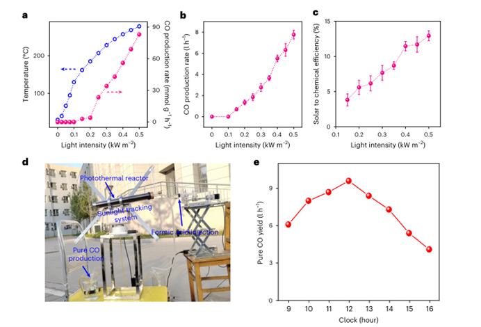 甲酸的脱水是一个吸热反应(ΔH = 26.45 kJ mol−1),需要二次能量的输入。为解决二次能耗问题,研究人员构建了光热甲酸分解系统。将F-ZrO2放入TiC/Cu基光热反应器中,该系统仅由太阳光驱动。在0.1 kW m−2的太阳光照射下,甲酸发生光热分解,催化剂温度达到130 ℃。当光照强度增加到0.5 kW m−2时,催化剂温度上升到278 ℃,CO生成速率显著增加到83 mmol g−1 h−1。结果表明,光热甲酸分解可以在微弱的自然光照下直接进行。由于F-ZrO2可以规模化合成,因此采用40 g粒状F-ZrO2进行规模化光热甲酸催化分解,其中研究人员使用的TiC/Cu基反应器的日照照射面积为0.036 m2。当光照密度为0.15 kW m−2,CO生成速率为~0.55 l h−1,甲酸转化率高于63%。当光照密度提升至0.5 kW m−2,甲酸转化率高达92.4%。该研究展示的光热系统于2023年10月10日在中国河北省保定市进行了测试。在室外阳光照射下,室外系统的纯CO产率从4.1 l h−1调整到9.6 l h−1,总纯CO产率为55.4 l /天,相当于1538 l m−2 /天。液体甲酸每日用量为150 ml,工作日甲酸平均转化率高于60%。通过计算分析,研究人员表明该催化-光热系统能够展现出巨大的经济价值,有望被规模化应用。