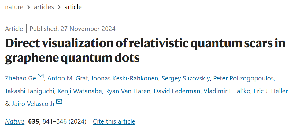原文信息:Ge, Z., Graf, A.M., Keski-Rahkonen, J. et al. Direct visualization of relativistic quantum scars in graphene quantum dots. Nature 635, 841–846 (2024).