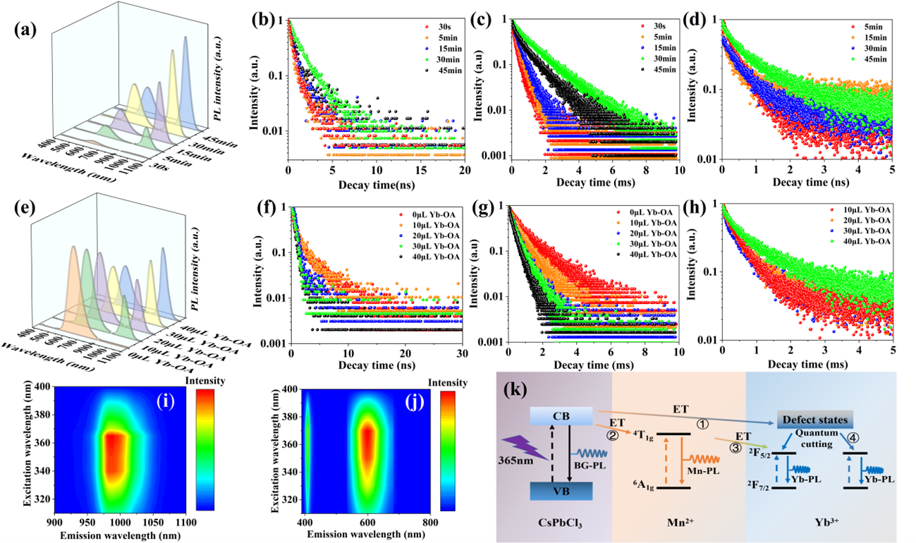 (a)CsPbCl3:Mn/Yb NCs中激子复合、Mn、Yb的光致发光光谱以及(b-d)在不同紫外光照射时间下的光致发光寿命衰减曲线。(e)CsPbCl3:Mn/Yb NCs中激子复合、Mn发射、Yb发射的光致发光(PL)光谱以及(f-h)在不同Yb3+掺杂含量下的光致发光寿命衰减曲线。 伪彩色图显示了(i)Yb发射以及(j)激子复合和Mn发射随激发和发射波长的依赖性。(k)CsPbCl3:Mn/Yb NCs内部能量传递过程的示意图。