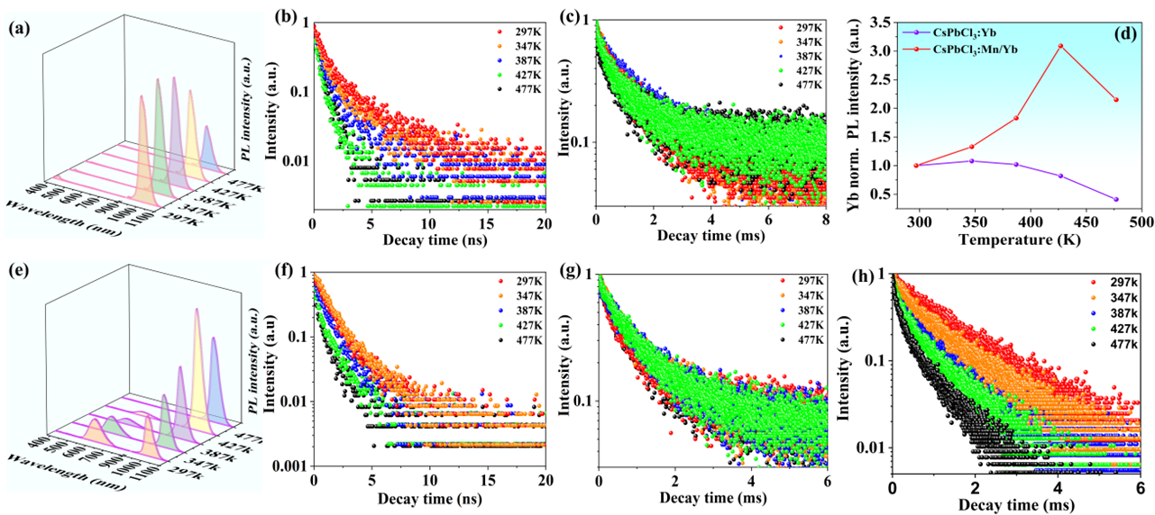 (a)在不同温度(297 K至477 K)下,CsPbCl3:Yb NCs中激子复合和Yb发射的光致发光(PL)光谱以及(b, c)衰减曲线。(d)在不同温度下,CsPbCl3:Yb和CsPbCl3:Mn/Yb NCs中Yb3+发射的归一化光致发光强度。(e)在不同温度(297 K至477 K)下,CsPbCl3:Mn/Yb NCs的光致发光(PL)光谱。(f)激子、(g)Yb和(h)Mn在不同温度下的光致发光寿命衰减曲线。