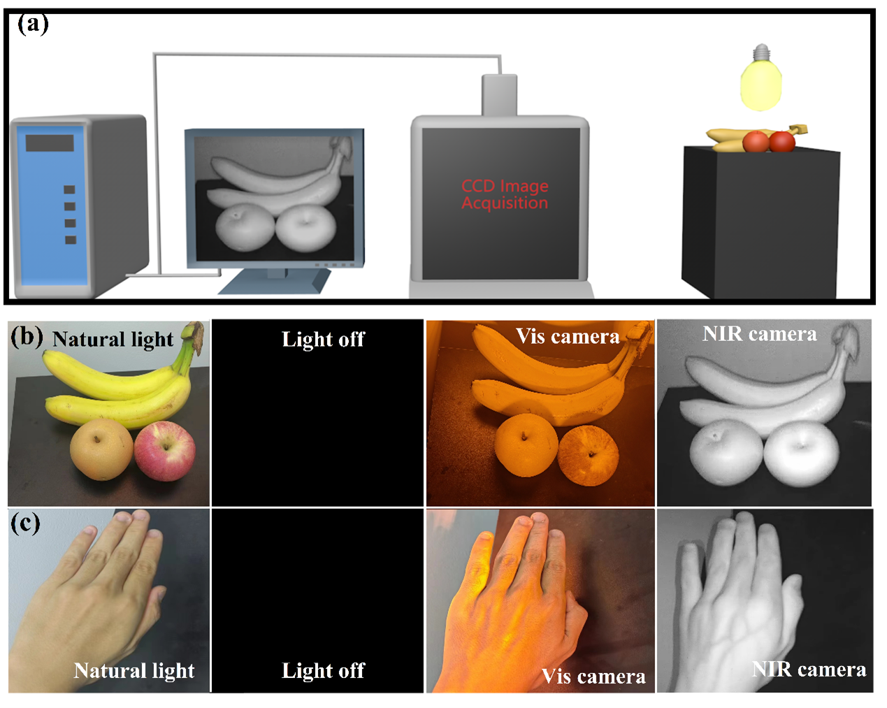 (a)制造完成的pc-LED器件应用的示意图。当制造完成的pc-LED器件开启或关闭时,分别用可见光相机和近红外相机拍摄的(b)水果和(c)手掌的照片。