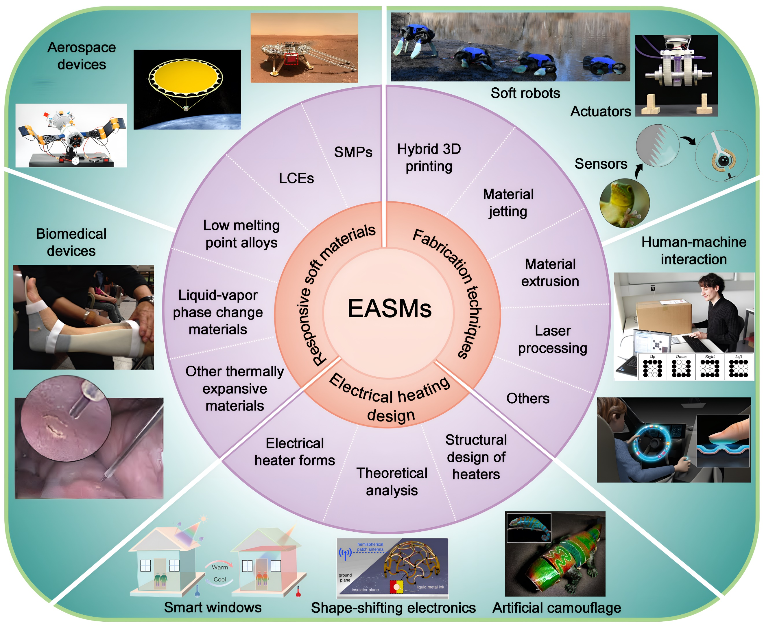随后,系统地总结了集成各类电加热器件的EASMs制造技术及其基本原理、特点与局限(表1)。综述了EASMs在航空航天、生物医疗、软体机器人和人机交互等九大领域的应用前景。