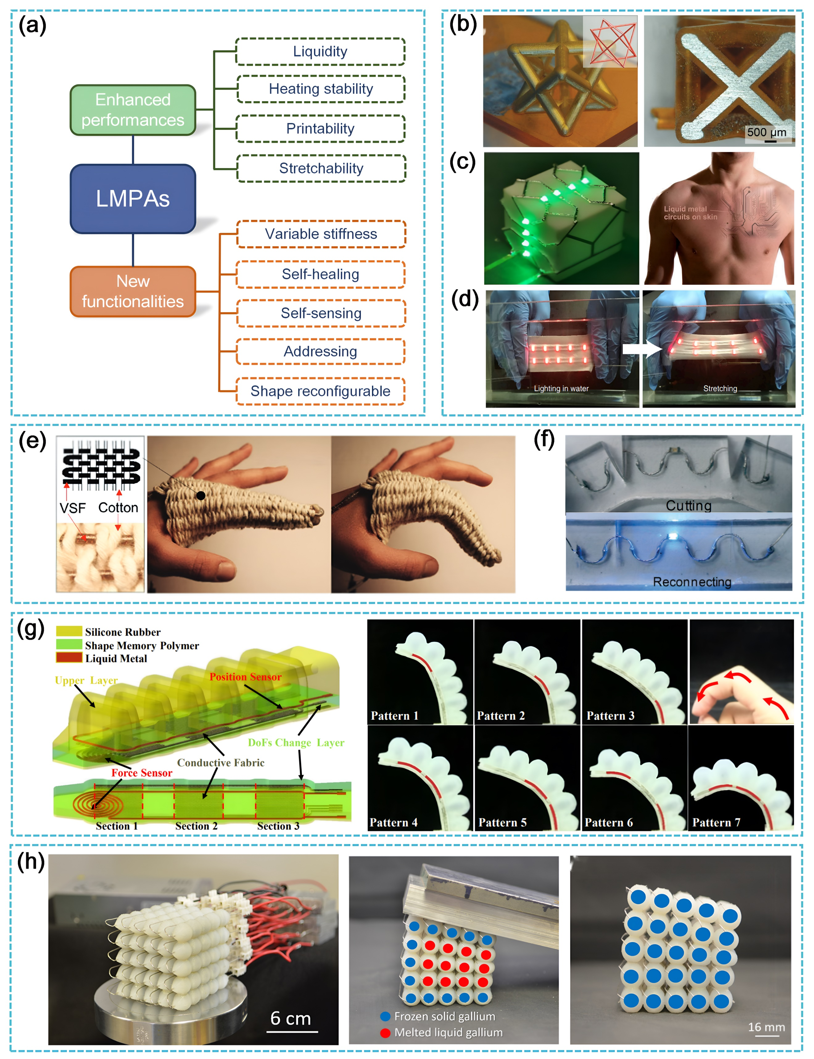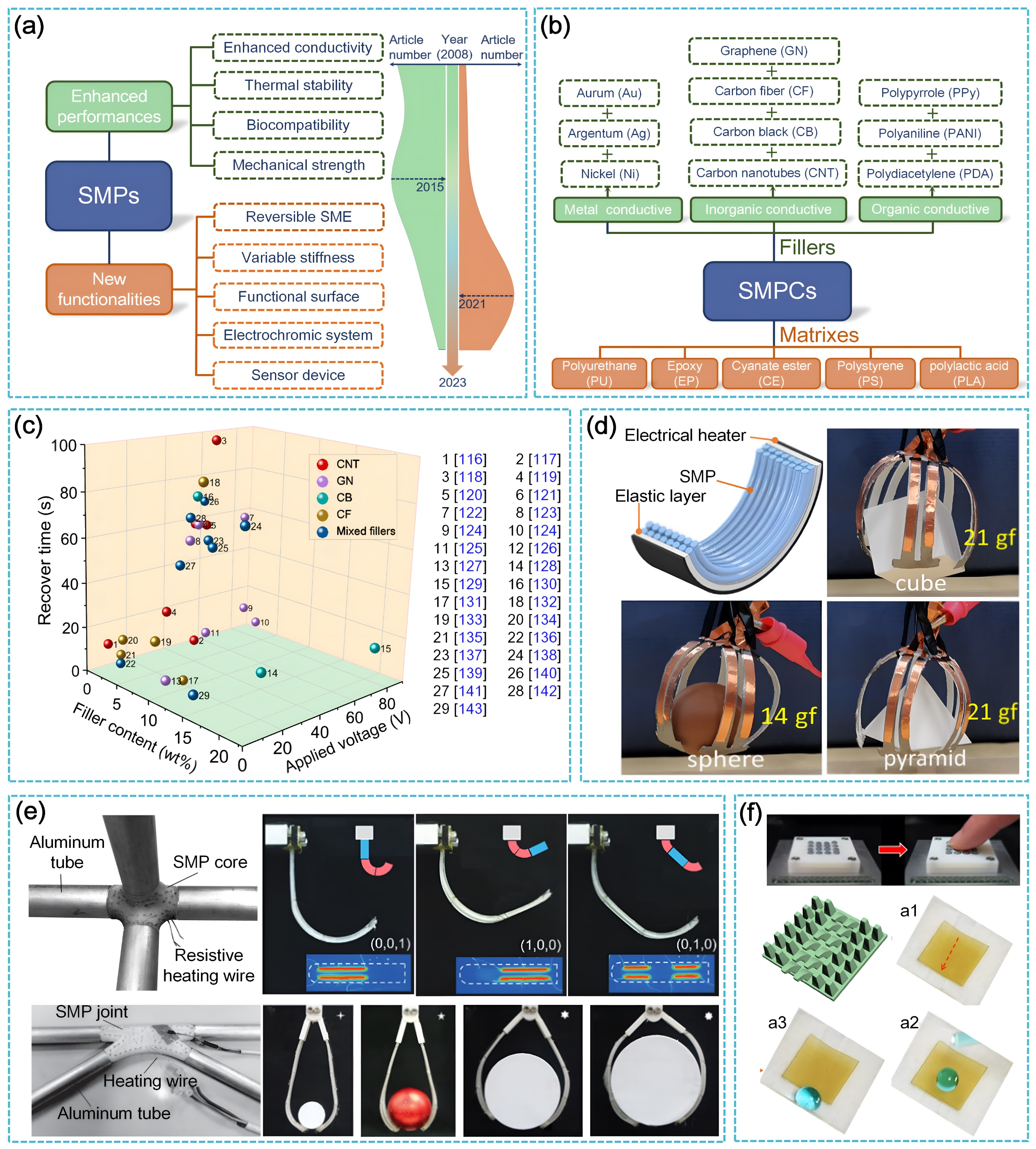 首先,论文分析了面向EASMs的电热激活技术在航空航天、智能电子、人机交互等前沿领域的工程需求及相对其他竞争技术(包括气压、电场、光场、磁场驱动等)的优势(图2)。进而建立了EASMs材料库,包括形状记忆聚合物(SMP,图3)、液晶弹性体(LCE,图4)、低熔点合金(LMPA,图5)、液气相变材料(LVPCM,图6)和其他热胀材料,系统地阐述了上述EASMs的激活机制、独特性能与功能并给出了选材原则(图2b)。