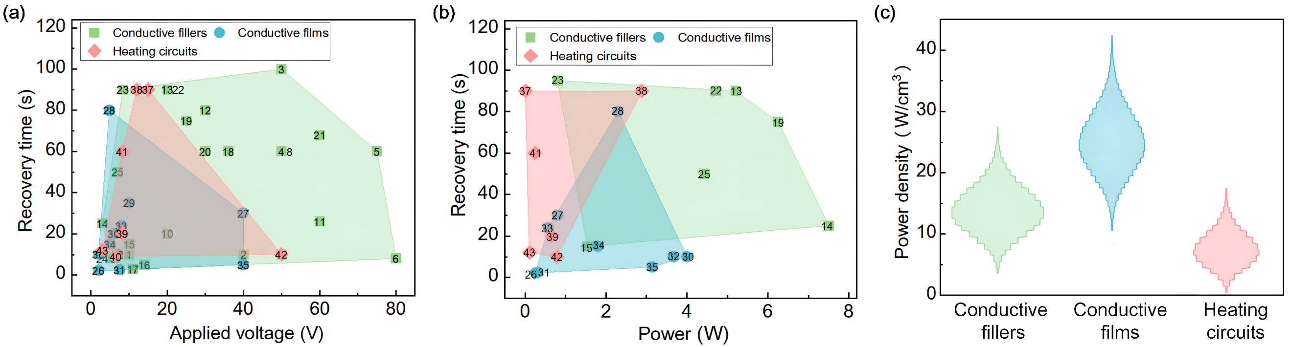 其次,重点讨论了电加热器件的设计问题。电加热器件在智能软材料中的集成形式分为导电填料、导电薄膜和加热电路三种类型(图7),从功耗角度对比了这三类电加热器件的加热性能(图8),从电-热-力多场耦合的角度阐述了面向EASMs理论模型的发展与挑战,从结构设计角度讨论了加热电路结构-性能(加热、力学性能)间的关系。