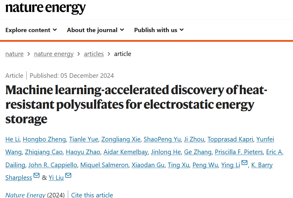 原文信息:Li, H., Zheng, H., Yue, T. et al. Machine learning-accelerated discovery of heat-resistant polysulfates for electrostatic energy storage. Nat Energy (2024).