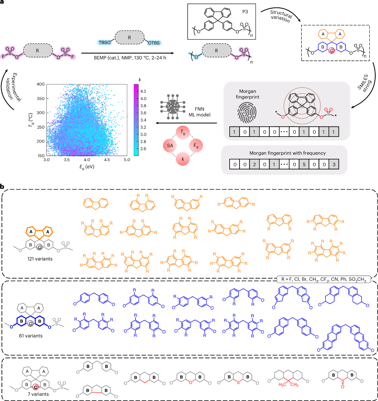 该研究通过利用先进的ML技术,对聚硫酸酯的主链结构进行了全面筛选。这种方法促进了分组比较和定量评估,揭示了特定结构特征对硫酸盐连接聚合物的关键性能指标(如带隙和玻璃转变温度)的影响。研究发现,聚硫酸酯P6展现出卓越的热韧性,具有显著的玻璃转变温度、较大的带隙和显著的介电常数。研究结果标志着在利用ML辅助方法发现和优化介电聚合物方面的重大进展。