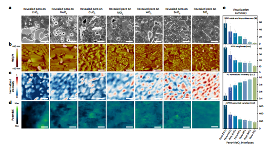 随后,研究人员将脱粘后的钙钛矿,进行了不同的成像表征,以可视化不同Pero-MeOx界面中埋藏的钙钛矿,并总结了从图像中提取的参数。利用扫描电镜(SEM)和原子力显微镜(AFM)显示了各种揭露的钙钛矿的形态。