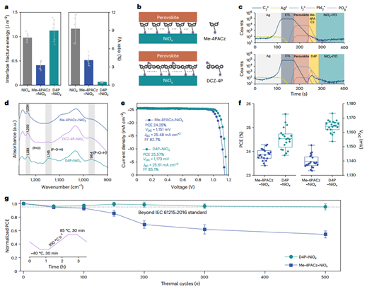基于上述挑战,近期新加坡国立大学侯毅教授团队设计开发了一种脱键技术来揭示PSCs中的强键/高反应性和弱键/低反应性异质界面。这种方法使研究人员能够对不同阶段的相互作用进行深入分析,包括初始晶体生长阶段和长期老化阶段。该研究结果表明,在钙钛矿晶体生长过程中,界面键、质子转移相互作用和降解之间存在相关性。研究人员还发现热老化放大了质子转移反应,而电子空穴转移反应在光老化中更为突出。为了克服机械键合和化学降解之间的矛盾,研究人员将[4-(3,6-dimethyl-9H-carbazol-9-yl)butyl]phosphonic acid (Me-4PACz)和9H,9′H-[3,3′-bicarbazole]-9,9′-diylbis(butane-4,1-diyl))diphosphonic acid (DCZ-4P)等SAM分子混合,在金属氧化物和钙钛矿界面引入额外的膦酸锚定基团,以增强键合。这种方法加强了异质界面键合,同时最大限度地减少了不良化学反应。该PSCs不仅实现了25.6%的最高效率(认证25.4%),而且还表现出更高的稳定性,在1,000小时的运行和热老化测试后保持90%的效率,并且在500次更严格的热循环评估中,目标PSCs保持了95%的初始PCE,超过相应的国际标准。