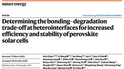 文献链接:Determining the bonding–degradation trade-off at heterointerfaces for increased efficiency and stability of perovskite solar cells,2024,https://doi.org/10.1038/s41560-024-01680-x)