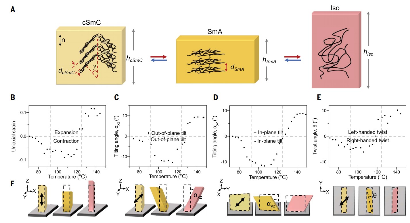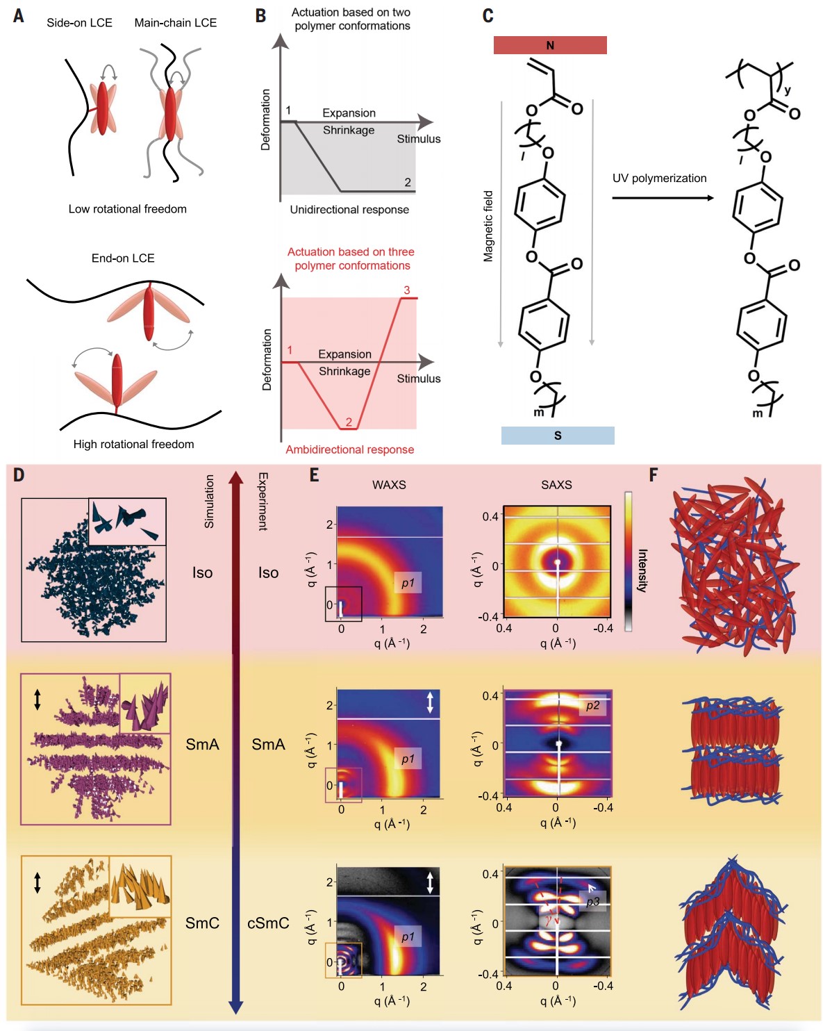 - 该研究开发了能够实现多步骤双向变形(如先收缩后扩张)的液晶弹性体,突破了传统软材料单向变形的限制。并通过分子设计和聚合过程,创造了在未聚合单体中不存在的高阶液晶相(cSmC和SmA),扩展了液晶弹性体的相变行为。