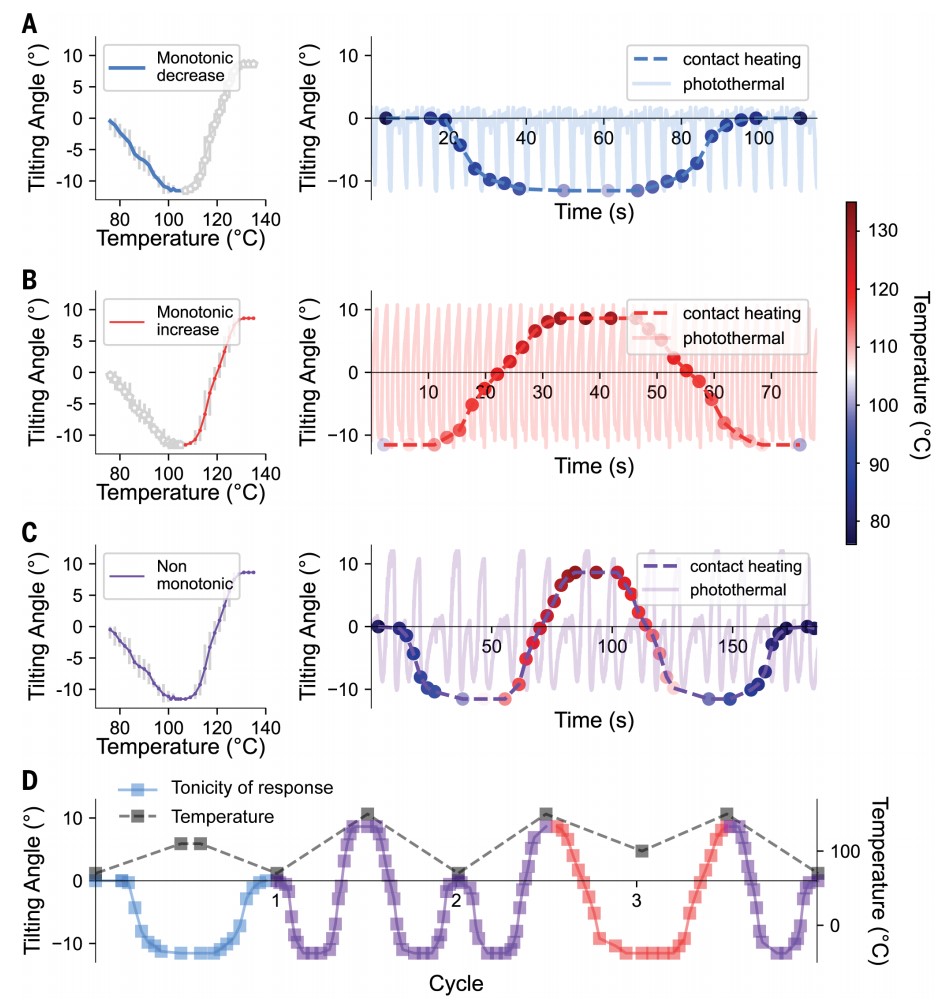 近期,哈佛大学研究团队采用了一种创新的方法来设计液晶弹性体(LCEs),通过结合介质自组装、聚合物链的弹性以及聚合诱导的应力,成功创造出具有两种不同液晶相——貌相近晶C(cSmC)和近晶A(SmA)的新型LCEs。这种材料在经历cSmC到SmA再到各向同性(Iso)相的转变过程中,其微观结构中的应变场发生了异常的反转,从而导致了独特的相反变形模式。具体来说,这些变形模式包括连续的收缩或膨胀,以及在相反方向上的右手或左手扭曲和倾斜,甚至能够产生高频的非单调振荡。这种双向运动是可逆的,意味着材料能够在宏观尺度上实现复杂的高斯变换,为设计能够在不同相态之间转换并执行复杂运动的智能材料提供了新的可能性。相关文章以“Programming liquid crystal elastomers for multistep ambidirectional deformability”为题发表在Science上。
