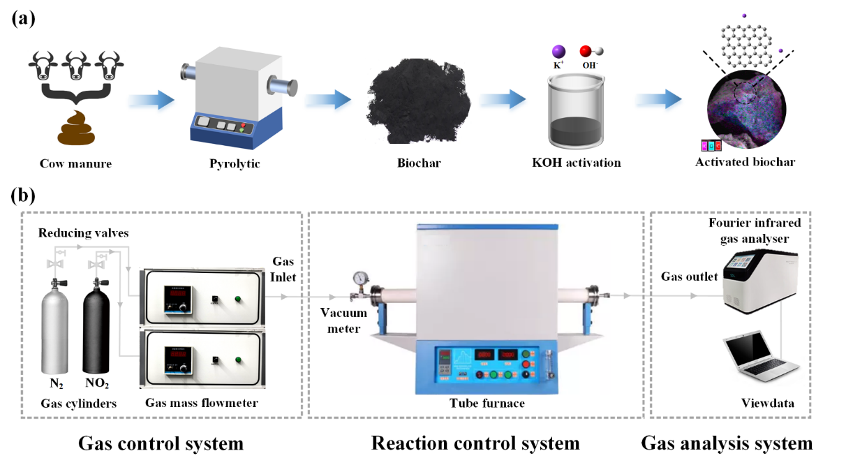 图1: (a)活化生物炭制备过程;(b)固定床反应装置。