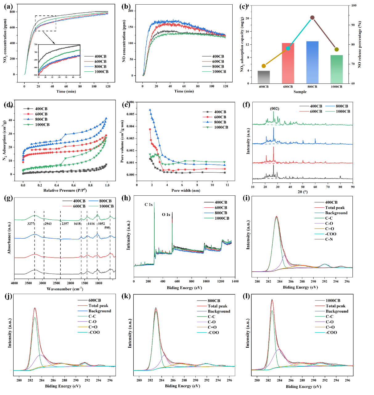 将生物炭置于固定床反应器中,通入NO2气体进行实验,获得不同热解温度下制备的牛粪生物炭对NO2气体的吸附和还原能力。图2a-c分别展示了NO2气体的吸附曲线、NO气体的释放曲线、NO2气体的吸附量和NO气体的释放速率。在吸附还原反应过程中,NO2气体主要与碳表面的活性位点反应生成-C(NO2)络合物,发生还原反应生成NO气体和-C(O)络合物。不同热解温度制备的牛粪生物炭样品的NO2气体吸附量和NO气体释放速率一致,顺序为800CB > 600CB > 1000CB > 400CB。并使用BET、XRD、FTIR和XPS对生物炭的表面结构进行进一步分析,如图2d-l所示。