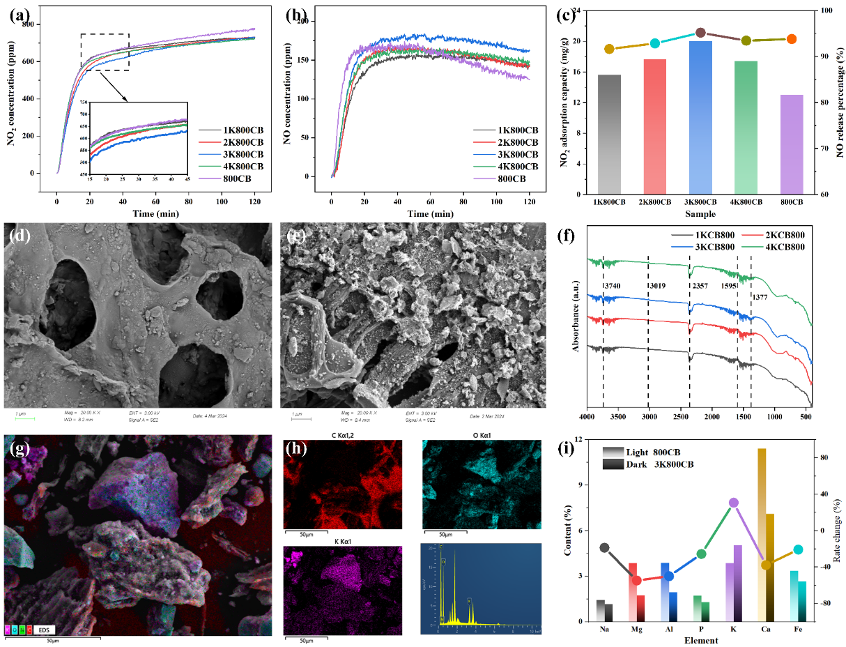 图3: (a-b)生物炭吸附和还原NO2过程中的气体析出曲线;(c)生物炭对NO2气体的实际吸附量和NO气体释放百分比;(d-e)生物炭和KOH活化的生物炭样品的SEM图像;(f)KOH活化的生物炭样品的FTIR光谱;(g-h)生物炭和KOH活化的生物炭样品的SEM-EDS图像;(i)生物炭和KOH活化的生物炭样品的主要矿物质含量。