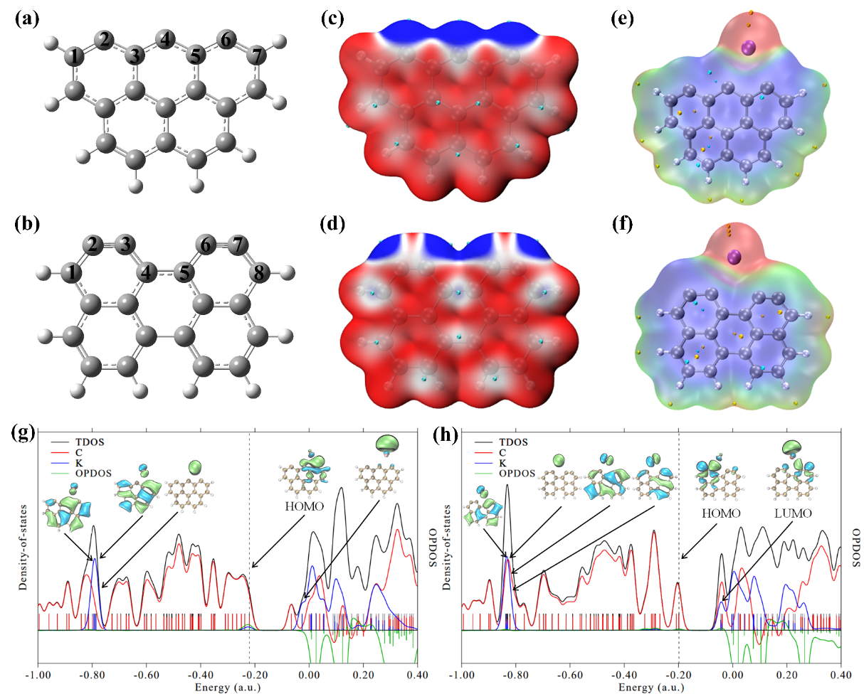 图4: (a-b)ZR和AR的分子结构;(c-d) ZR和AR的局部电子附着能;(e-f) KZR和KAR的静电势;(g-h) KZR和KAR的态密度及分子轨道。