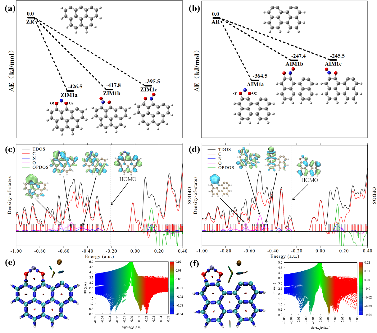 图5. (a-b)NO2分子在ZR和AR上吸附的能量变化;(c-d)ZIM1和AIM1的态密度及分子轨道;(e-f)KZIM1和KAIM1的相互作用力及散点