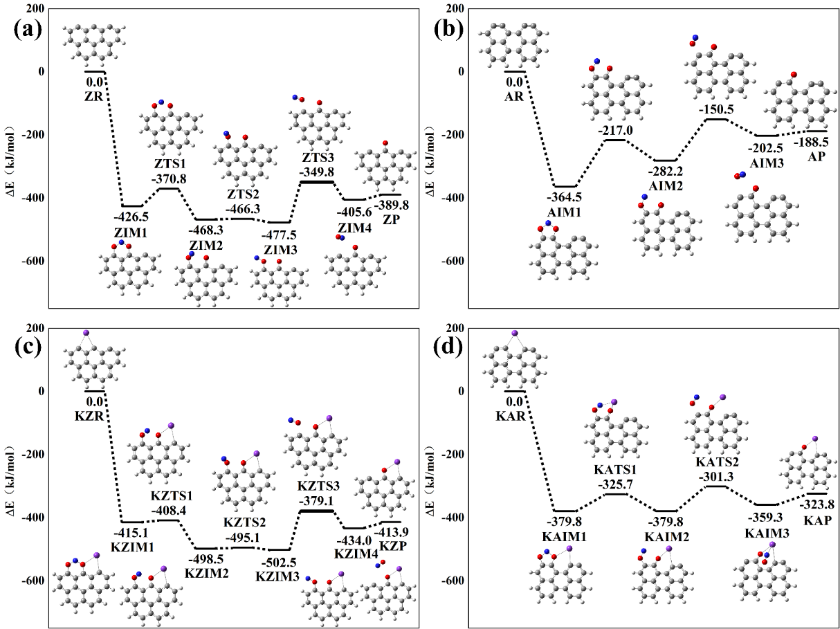 这里,模拟了基于ZR、AR、KZR和KAR的四种NO2吸附还原反应途径,旨在阐明微观反应机理和K原子的影响,如图6所示。能谱中的能量变化是基于反应物和单个NO2分子计算的差异。值得注意的是,K原子的存在并不改变原有的反应途径,因此可以通过反应途径的能垒差和重要分子结构的波函数分析来研究其影响。