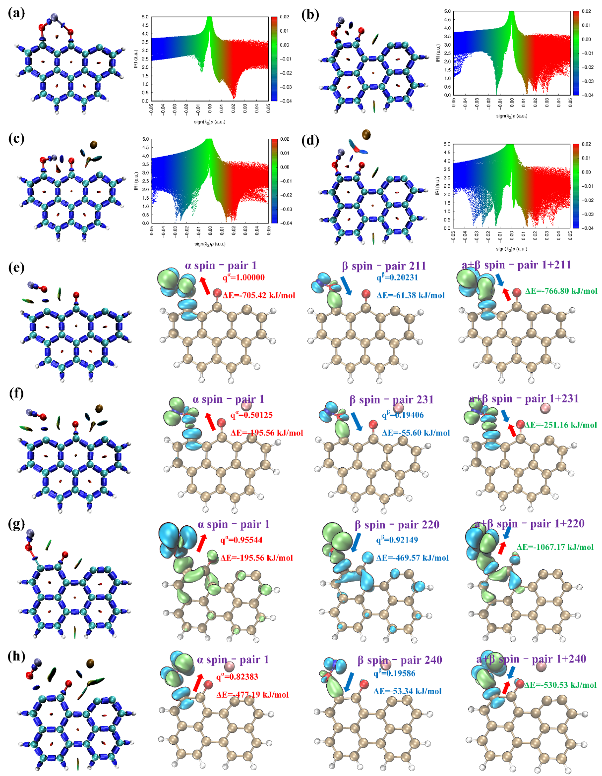 基于图7a-d中的相互作用力分析,结合K原子周围的黄绿色区域,表明K原子对NO2分子中N-O键断裂的促进作用主要是通过范德华力产生的。分析化学键断裂过程中的轨道相互作用和生物炭边缘NO解吸过程中的电子密度转移机制,如图7e-h。分析表明K原子的存在显著降低了断裂NO2分子内N-O键的能垒,并通过影响特定轨道中的电子转移水平而增强了NO的解吸。这种有益的影响在扶手椅边缘结构中尤其明显。