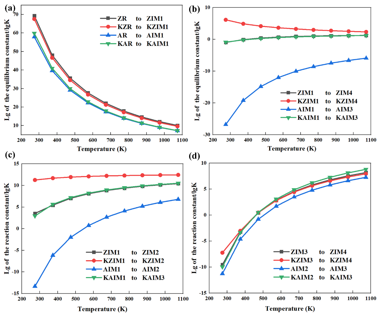 对KOH活化生物炭表面NO2吸附和还原两个反应过程进行热力学分析,可以更直观地了解其内部反应机理。在图8a中,NO2分子吸附反应过程的平衡常数都大于105,表明该反应是单向反应并且完全正向进行。在图8b中,通过比较发现红线高于黑线,绿线高于蓝线。这说明K原子的存在对NO2还原反应的化学平衡常数有影响,起到一定的促进作用。通过动力学分析进一步研究反应过程中的反应步骤。如图8c-d所示,存在K原子时的反应速率常数大于不存在K原子时的反应速率常数,这种差异在低温下更明显,说明K原子促进了NO2中N-O键的断裂和生物炭对NO的解吸。
