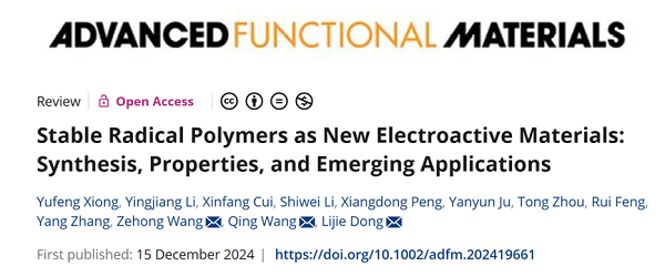 近期,武汉理工大学董丽杰教授团队与美国宾夕法尼亚州立大学王庆教授等在材料领域期刊《Advance Functional Materials》上发表题为“Stable Radical Polymers as New Electroactive Materials: Synthesis, Properties, and Emerging Applications”的综述文章。这项工作总结了研究较为广泛且具有代表性的稳定自由基聚合物,描述了它们的顺磁性、氧化还原活性、荧光,导电等性能,并概述了该领域现有的稳定自由基聚合物材料制备方法以及表征手段。此外,还重点介绍了基于稳定自由基聚合物的前沿功能材料在电活性材料、磁学、光电子学和生物医学等多个领域的应用(图1)。全面探讨了这些聚合物的物理化学性质、电子结构与功能性之间的关系。最后,文章分析了自由基化学与材料功能化方面的主要局限性与挑战,并指出了未来研究中需关注和进一步发展的关键问题。