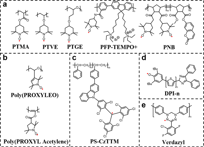 图 2. 不同种类的稳定自由基聚合物: (a) TEMPO, (b) PROXYL, (c) Tertiary carbon, (d) Phenolic, (e) Verdazyl