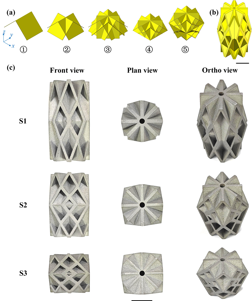 自然界的生物体经过长时间的进化,获得了适应其生存环境的最佳结构组成,并带来了能够满足结构功能的机械性能。承受这种高强度冲击的能力归功于趾尖前趾内层的平行结构,该结构以规则的三角形波纹单元排列。受孔雀螳螂虾螯的启发,研究人员使用仿生三角形波纹作为构建新型超材料的基本单元。在传统的波纹承重体系中,波纹结构都是沿一个方向布置的,其力学性能只能在这个方向上发挥作用。基于以性能为导向的设计原则,研究人员创新性地提出了多维性能拓展策略,将三角波纹结构的力学性能向四个方向延伸。TCPL超材料单胞的结构组成如下所述。首先,沿着x轴建立一个三角形波纹,然后沿着y轴和两条对角线建立另外三个三角形波纹。这四种波纹相互连接、支撑、保持和约束,它们之间的相互作用可以使结构更加紧凑,性能实现更加充分。为了便于单元胞之间的连接形成超材料,沿着立方轮廓切除周围区域。与桁架结构相比,嵌入在超材料中的封闭空间的互联性显著增加了应变能的存储。通过镜像图1(a)④所示的结构,并从底部拼接,获得最终的TCPL单胞。