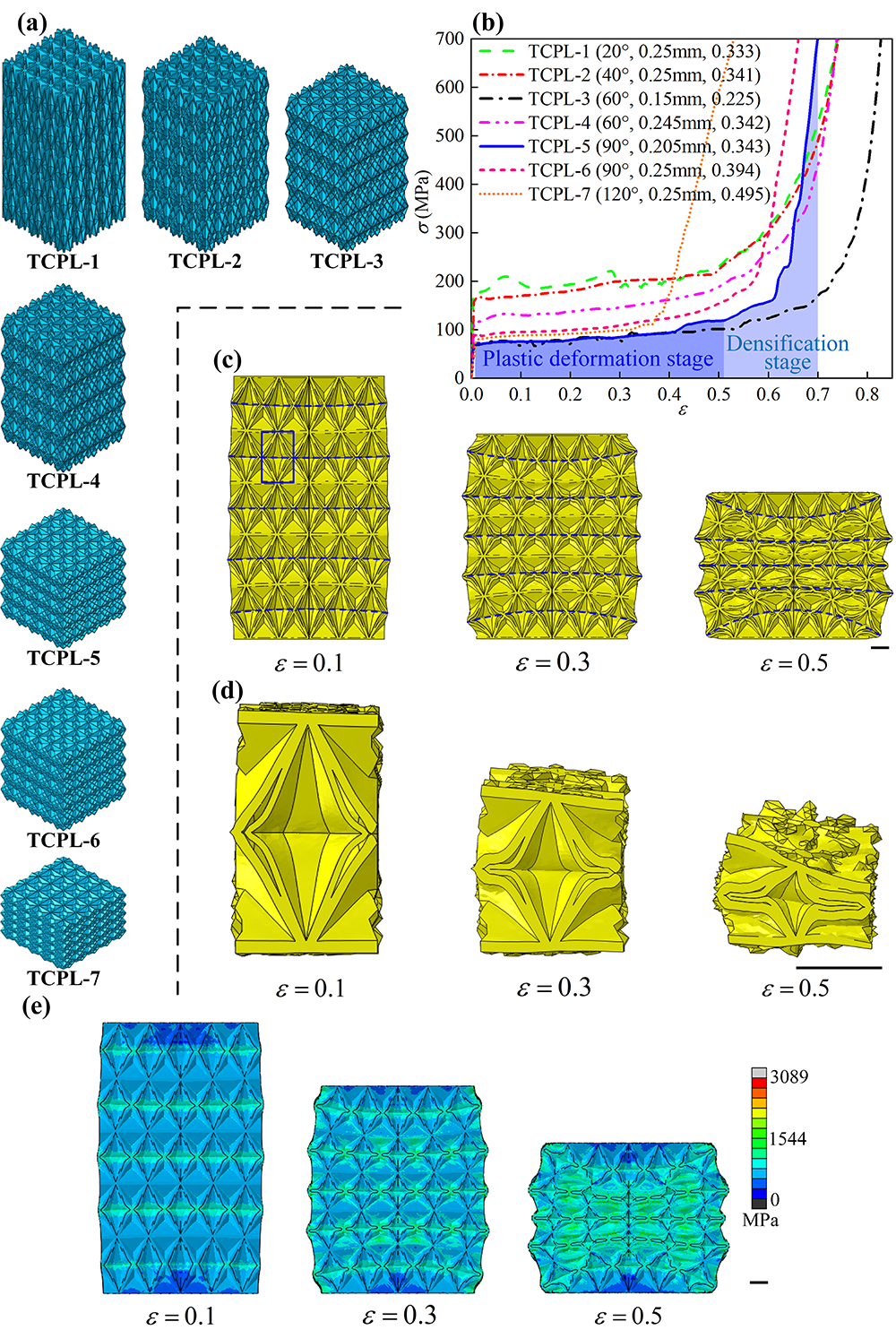 随着近年来新能源汽车、智能驾驶、航空航天产业的蓬勃发展,车辆和飞机的极限速度正在迅速增加,因此对材料和结构的承重和吸能性能提出了严苛的要求。经典的力学超材料的设计和研究绝大部分只停留在弹性阶段,而车辆的极限速度增加而对飞机产生了迫切的需求和苛刻的要求优异的塑性性能。虽然有些超材料具有较好塑性性能,它们或者初始峰值应力很大,之后应力水平急剧下降,或者塑性阶段非常短,很小的应变就会发生失效,无法承受大变形,或者塑性阶段的整体应力水平比较低。只有极少数超材料能够经受住塑性大变形并提供比较高的应力水平,适用于能量吸收相关场景。