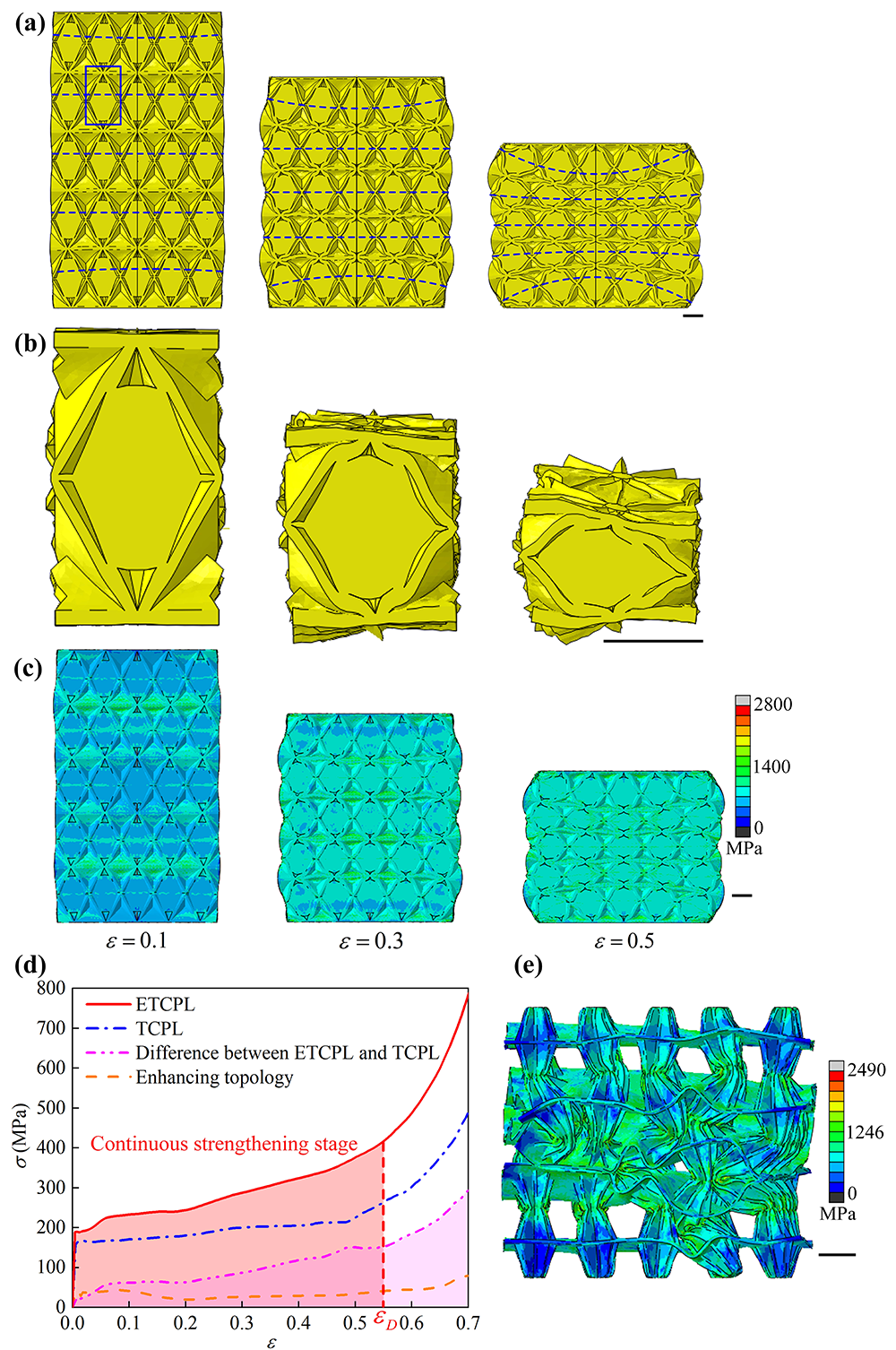 在随后的仿真研究中使用5×5×5单胞布局。从不同应变下的有限元变形图可以看出,ETCPL的剪切带呈圆形。插入增强相后,由于增强相与主相之间的物理连接,限制了壁板的横向扩张。当应力为0.5时,应力大小分布基本一致,在增强相作用下,整个超材料内部的应力有均匀分布的趋势,几乎没有梯度。在增强相超材料的压缩过程中,不能看到单胞的完全压缩变形。应力在增强相中的分布也具有随机性和不规则性,不能有效地分布应力。ETCPL和TCPL的差曲线应力值在应力为0.04后始终高于增强相超材料的应力值。