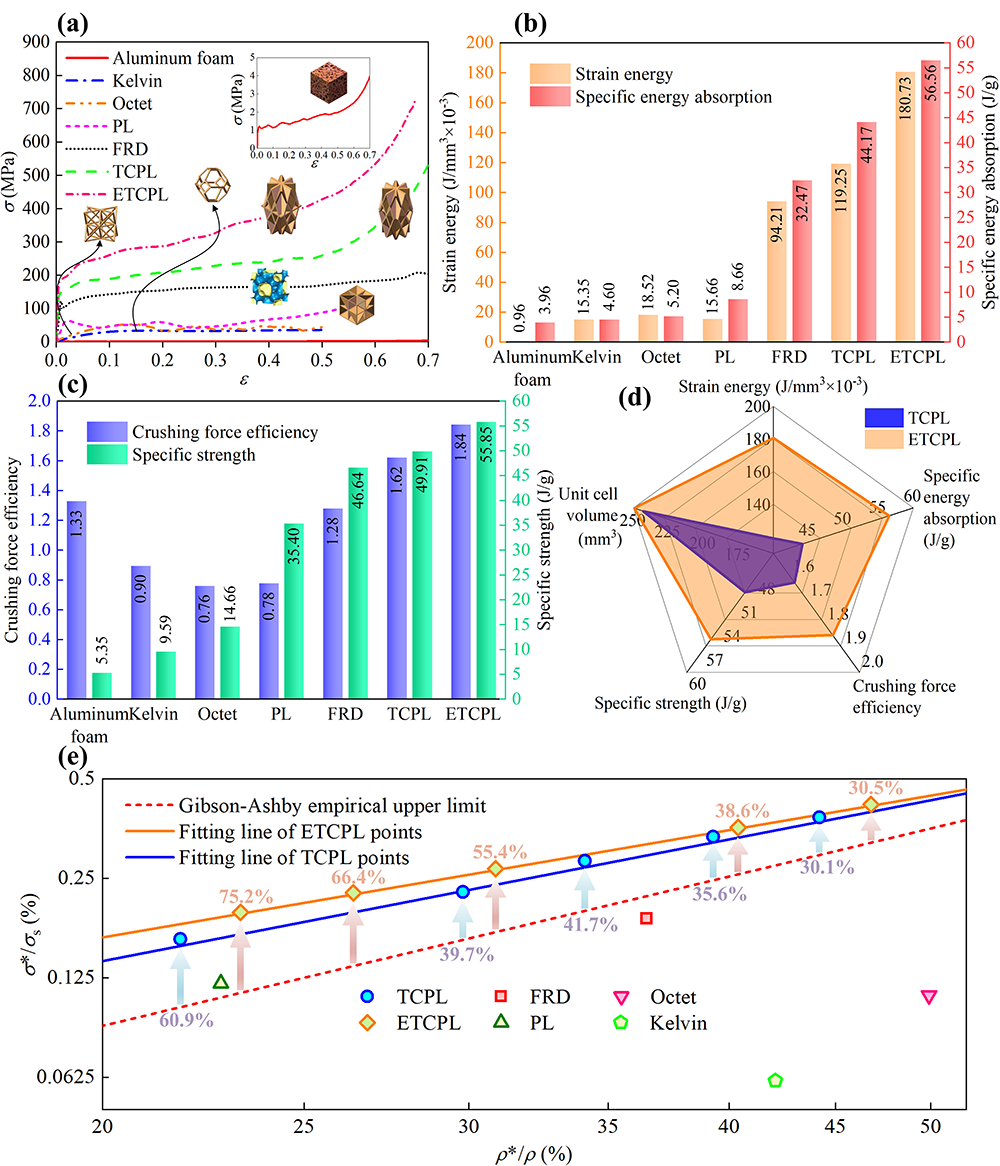 采用变形抑制策略优化后的性能取向型TCPL和ETCPL的压缩力学性能均明显优于其他典型力学多孔材料。ETCPL和TCPL在所有四个指标上都大大领先于其他多胞材料。与TCPL相比,ETCPL的体积只增加了2.67%,而SE的性能提高了51.56%,SEA的性能提高了28.05%,CFE的性能提高了13.58%,SS的性能提高了11.90%。增强相的加入不仅提高了ETCPL的应力水平,而且改善了其力学性能指标。与传统多孔材料泡沫铝相比,ETCPL的SE、SEA、CFE和SS分别提高了18667.19%、1327.18%、38.75%和943.83%,提高幅度巨大。