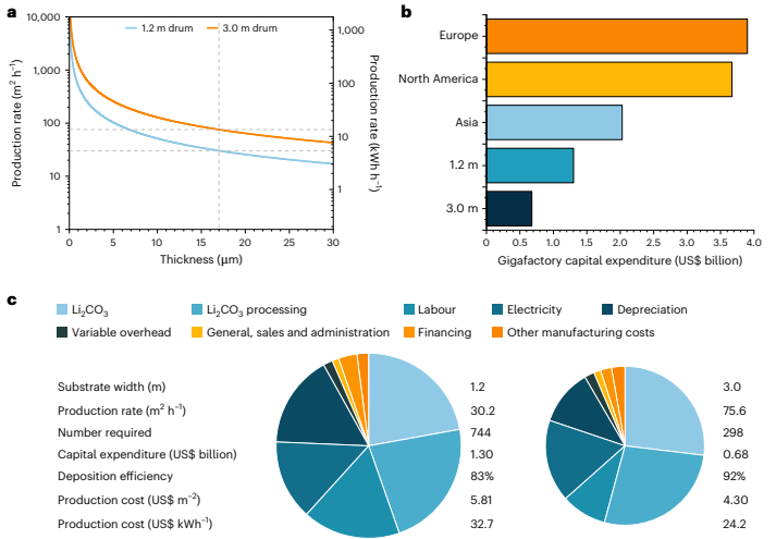 该项成果表明制造~17µm锂薄膜最有前途的技术是热蒸镀。技术经济评估显示,以西欧能源价格制造这种厚度的锂金属阳极的成本为每平方米4.30美元,相当于阳极成本为每千瓦时24.2美元(而传统石墨阳极的成本约为每千瓦时12美元)。在能源和劳动力成本较低的国家进行制造,可以进一步降低成本。考虑到SE和阳极成本,电池组的成本为158美元每千瓦时,而液态电池的成本为126美元每千瓦时。虽然这显示了制造固态电池的成本较高,但考虑到快速充电、高能量密度和提高安全性等诸多潜在好处,这个成本增加是合理的。