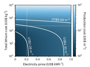 图5 纯化锂和电价对17µm锂金属阳极生产成本的综合影响。©The Author(s) 2024
