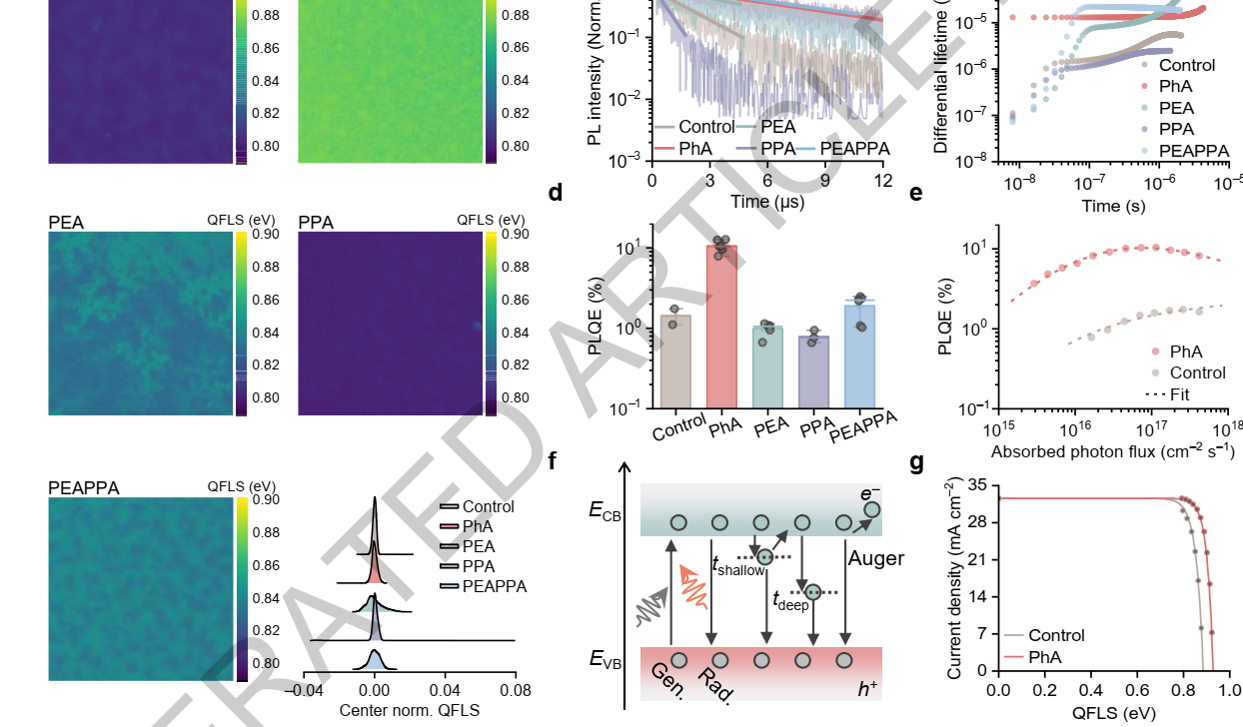 在本工作中,作者通过对Sn-Pb钙钛矿前驱体溶液化学性质的研究,揭示了氨基酸盐在调节溶液胶体性质、薄膜结晶以及光电性能方面的独特作用。由于羧酸可以对溶液胶体性质和薄膜结晶发挥调节作用,而铵盐则有助于提高薄膜的光电性能方,二者结合后氨基酸盐能显著改善了钙钛矿薄膜的均匀性和半导体质量,超过了单独使用这些功能基团的效果,制备的单结、双结和三结钙钛矿太阳能电池,分别实现了23.9%、29.7%和28.7%的光电转换效率(最高认证效率为29.26%)。以上发现为优化前驱体溶液、控制钙钛矿薄膜制备工艺,从而进一步提升光伏器件性能、推动其实际应用提供了新的思路。