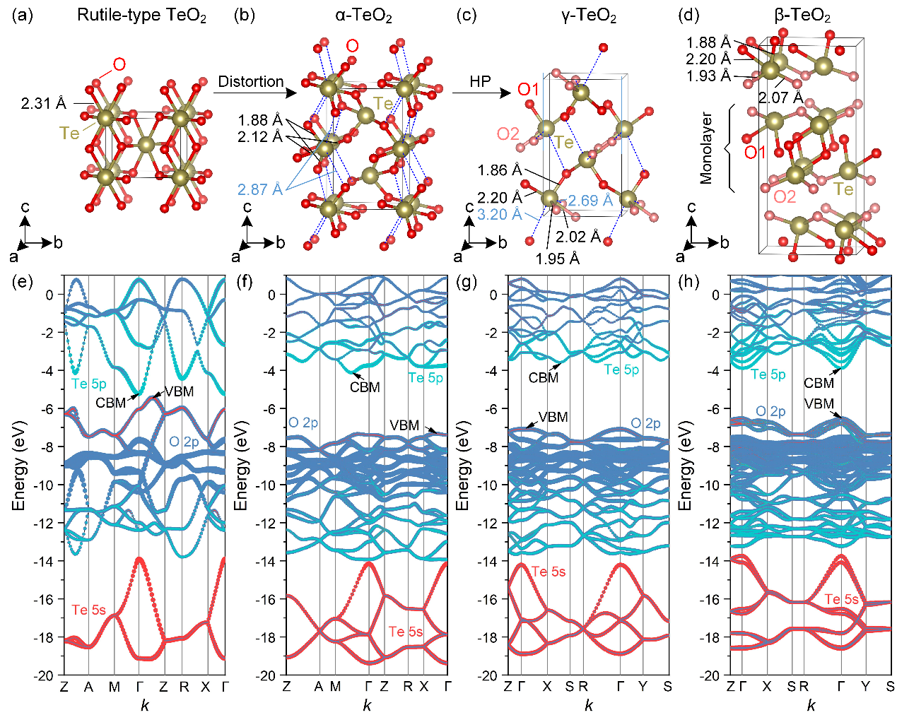图1 TeO2多形体的晶体结构和能带结构。注意,对于我们熟知的TeO2多形体(α相、β相和g相),Te 5s轨道太深,几乎不与O 2p轨道杂化,从而贡献价带顶。
