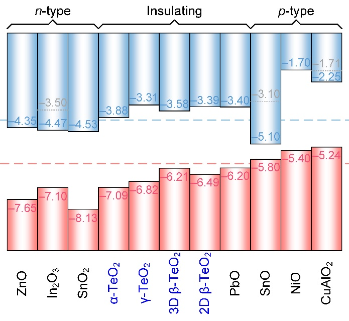 图2 TeO2多形体和相关氧化物的能带排列。根据经验性的掺杂极限法则,当导带底低于-4 eV时,容易掺成n型;当价带顶高于-6 eV时,容易掺成p型。TeO2多形体的导带底高于-4 eV,价带顶低于-6 eV,意味着其n型掺杂和p型掺杂都很困难,表现出绝缘的电学特性。