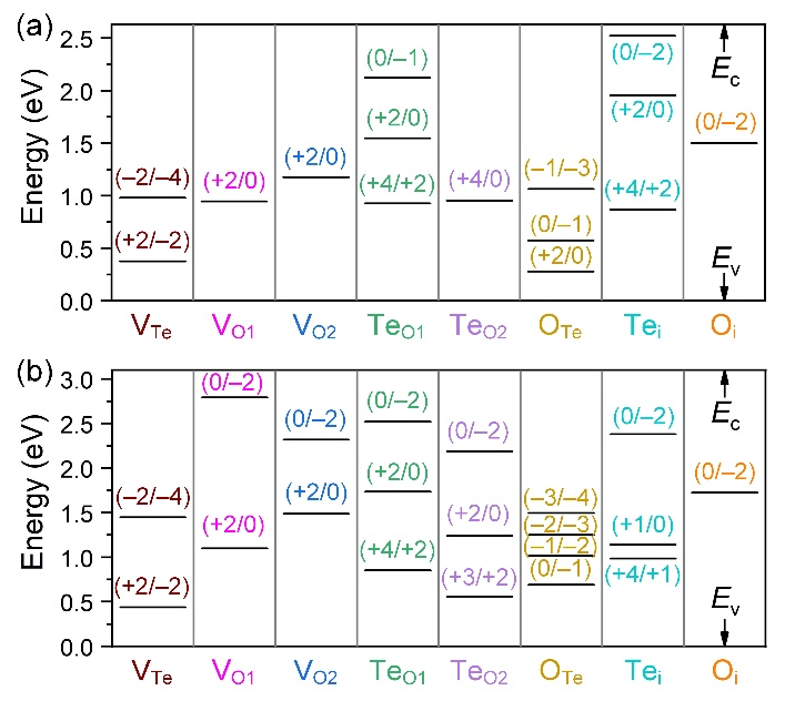图3 β-TeO2块体(a)和单层(b)中本征缺陷的转变能级。不论是块体还是单层,所有本征缺陷的转变能级都在带隙中,缺乏浅施主和浅受主,难以产生有效的n型和p型掺杂。